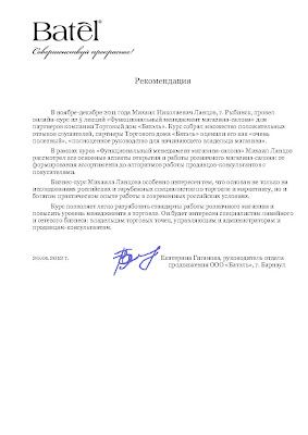 Рекомендация на онлайн-курс «Функциональный менеджмент магазина» руководителя отдела продвижения ООО«Батэль».